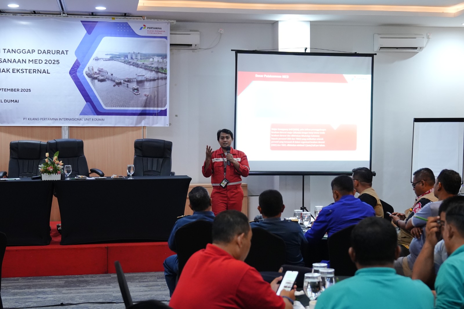Area Manager Communication, Relations & CSR PT KPI RU II Dumai Agustiawan menyampaikan bahwa kegiatan yang dijadwalkan pada pekan keempat September 2025 ini merupakan komitmen upaya perusahaan untuk memperkuat sistem manajemen tanggap darurat (emergency response) sekaligus membangun sinergi dengan seluruh pemangku kepentingan di wilayah operasi Kilang Pertamina Dumai.