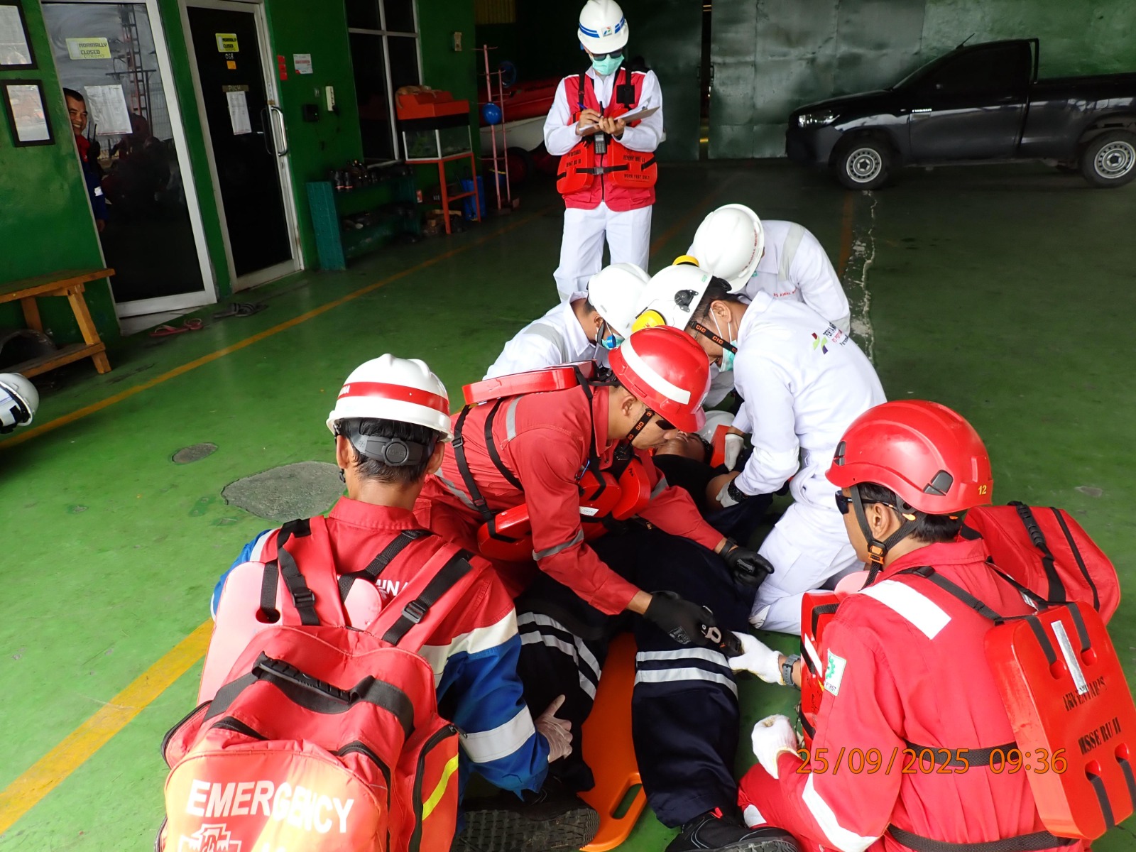 Latihan driil ini juga mencakup simulasi evakuasi korban, salah seorang awak kapal yang menjadi korban yang mendapatkan perawatan pertama di Poli Kesehatan Kerja serta dirujuk ke RSPD. Pada skenarion ini juga digambarkan satu orang lainnya merupakan crew yang jatuh ke laut namun berhasil diselamatkan, kondisinya stabil dan terus membaik.