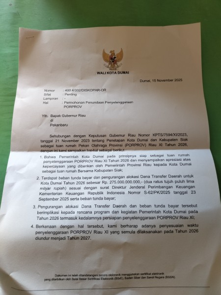 Informasi ini diperoleh berdasarkan surat resmi Wali Kota Dumai, Paisal, yang ditujukan kepada Plt. Gubernur Riau, SF Hariyanto, dengan Nomor 400.4/332/DISKOPAR-OR tertanggal 15 November 2025. Surat tersebut berisi permohonan penundaan penyelenggaraan PORPROV Riau XI dari 2026 menjadi 2027.